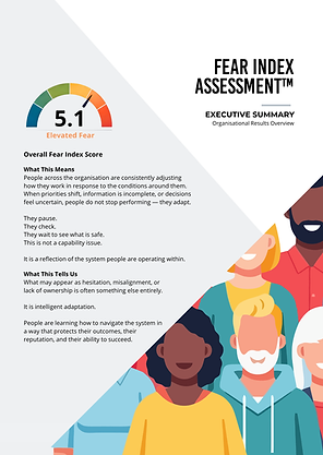 The Fear Index Assessment™, developed by Jumpseat Leadership, makes these conditions visible — revealing how people experience their environment and how that shapes behaviour across the organisation.